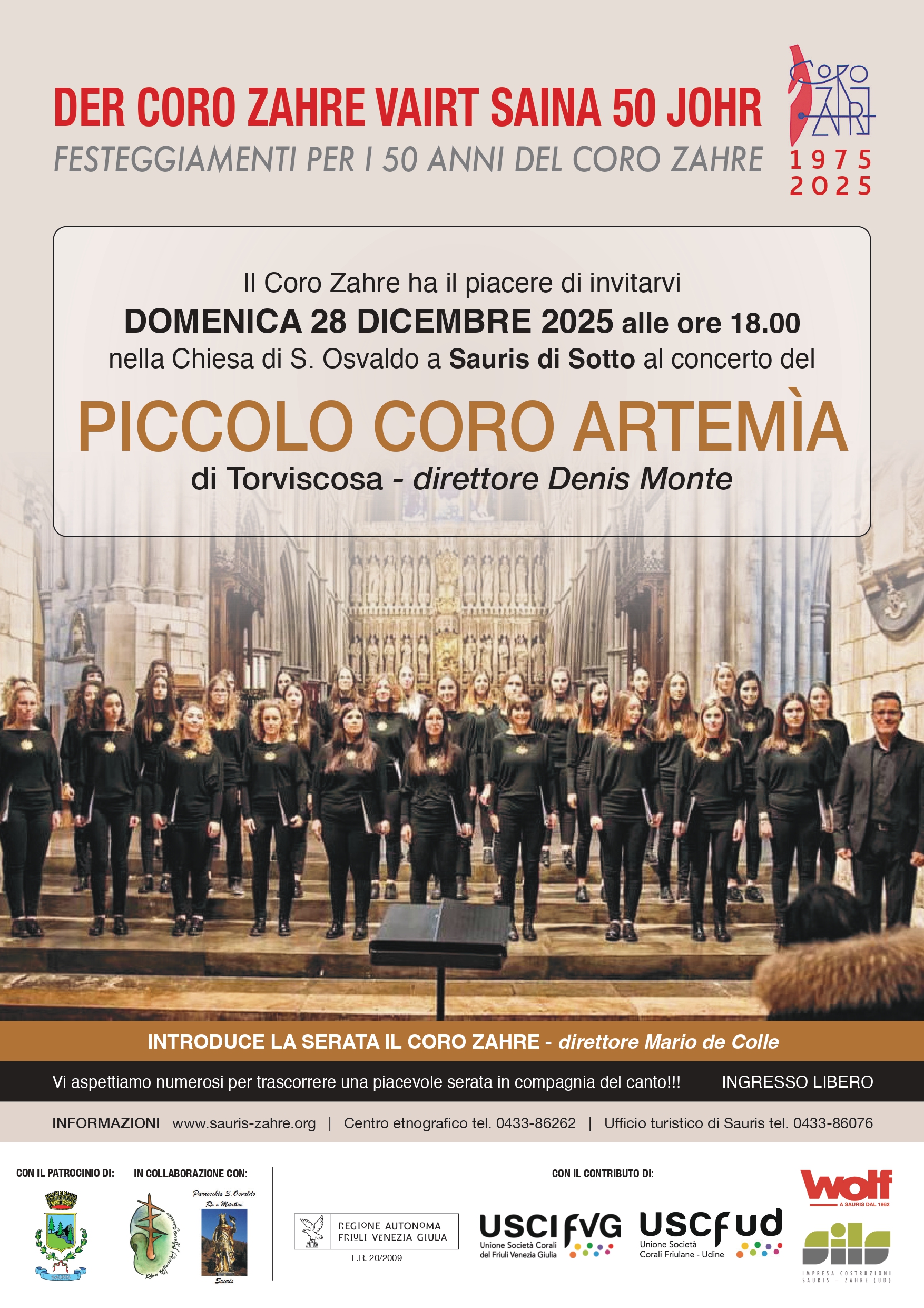 Domanica 28 dicembre, nella chiesa di S. Osvaldo a Sauris di Sotto alle ore 18:00, sarà protagonista il Piccolo Coro Artemia di Torviscosa, diretto dal maestro Denis Monte.