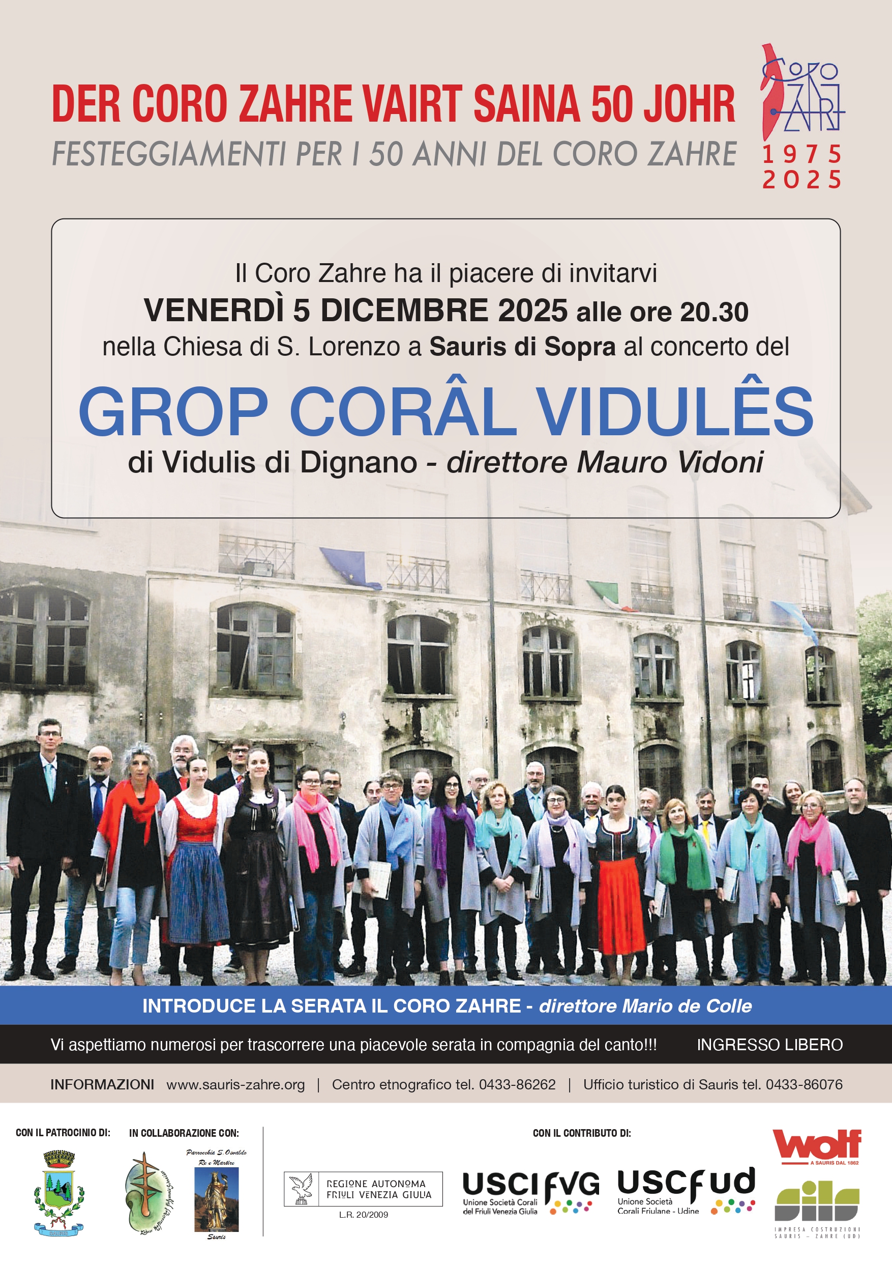 Venerdì 5 dicembre, nella chiesa di S. Lorenzo a Sauris di Sopra alle ore 20:30, si esibirà il Grop Corâl Vidulês di Vidulis di Dignano, diretto dal maestro Mauro Vidoni.