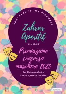 Venerdì 19 dicembre 2025 doppio appuntamento con la premiazione del concorso “Mai liebister maskar – La mia maschera preferita” e con il Zahrar aperitif presso il bar ristorante del Centro sportivo in località Treinkhe alle ore 17:30.